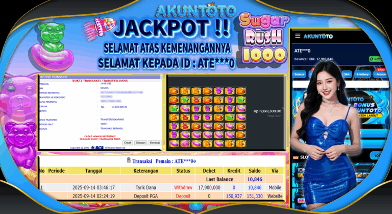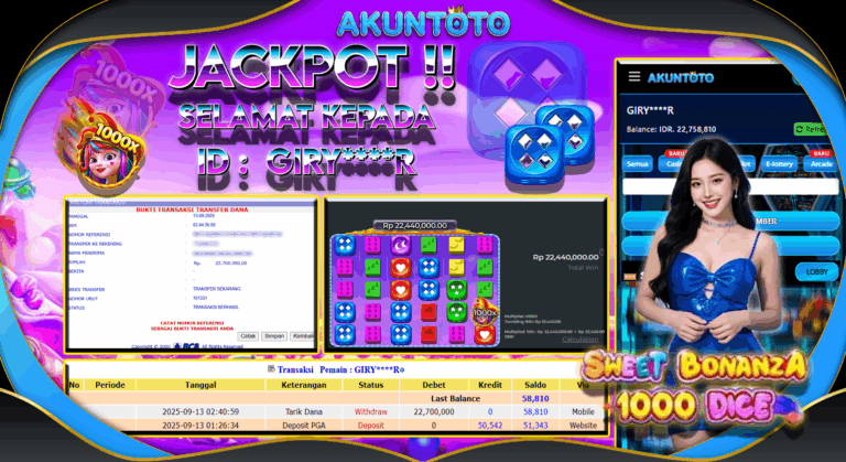 AKUNTOTO JACKPOT SLOT SWEET BONANZA 1000 DICE Rp 22.700.000 SABTU 13 SEPTEMBER 2025 Selamat kepada User id : GIRY****R Telah berhasil mendapatkan kemenangan besar pada permainanSWEET BONANZA 1000 DICE 5 – 10 menit pihak AKUNTOTO sudah melakukan transfer kepada pemilik User id dan dana sudah dapat di cairkan oleh pemenang. Bukti pembayaran yang kami berikan…