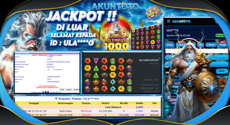 AKUNTOTO JACKPOT SLOT GATES OF OLYMPUS 1000 Rp 14.150.000 MINGGU 31 AGUSTUS 2025 Selamat kepada User id : ULA****G : Telah berhasil mendapatkan kemenangan besar pada permainanGATES OF OLYMPUS 1000 5 – 10 menit pihak AKUNTOTO sudah melakukan transfer kepada pemilik User id dan dana sudah dapat di cairkan oleh pemenang. Bukti pembayaran yang kami…
