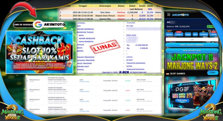 AKUNTOTO JACKPOT SLOT MAHJONG WINS 3 BLACK SCETTER Rp 7,600.000 SABTU 20 SEPTEMBER 2025 Selamat kepada User id : BANG****WKK Telah berhasil mendapatkan kemenangan besar pada permainanSLOT MAHJONG WINS 3 BLACK SCETTER 5 – 10 menit pihak AKUNTOTO sudah melakukan transfer kepada pemilik User id dan dana sudah dapat di cairkan oleh pemenang. Bukti pembayaran…