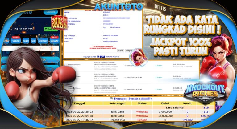 AKUNTOTO JACKPOT KNOCKOUT RICHES Rp 15.000.000 RABU 24 SEPTEMBER 2025 Selamat kepada User id : AK***F Telah berhasil mendapatkan kemenangan besar pada permainanKNOCKOUT RICHES 5 – 10 menit pihak AKUNTOTO sudah melakukan transfer kepada pemilik User id dan dana sudah dapat di cairkan oleh pemenang. Bukti pembayaran yang kami berikan merupakan bukti pembayaran yang SAH…