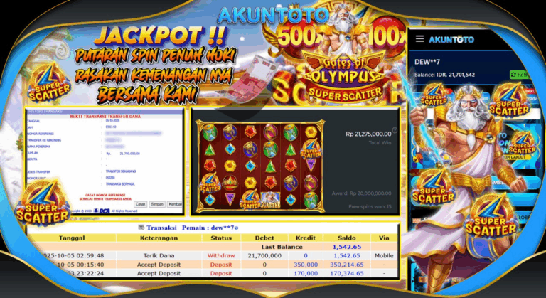 AKUNTOTO JACKPOT SLOT GATE OF OLYMPUS SUPER SCETTER Rp50.000.000 RABU 29 OKTOBER 2025 Selamat kepada User id KESA***3: Telah berhasil mendapatkan kemenangan besar pada permainanGATE OF OLYMPUS SUPER SCETTER 5 – 10 menit pihak AKUNTOTO sudah melakukan transfer kepada pemilik User id dan dana sudah dapat di cairkan oleh pemenang. Bukti pembayaran yang kami berikan…