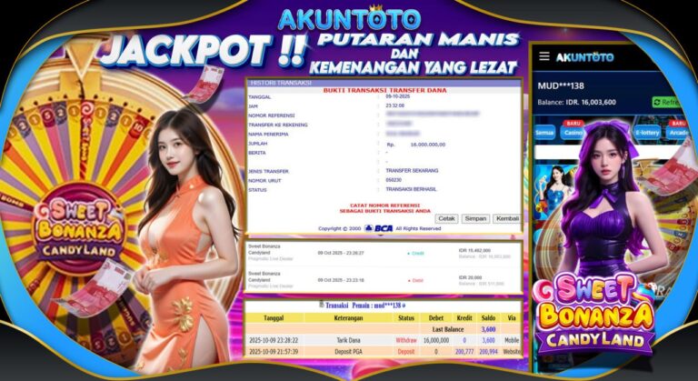 AKUNTOTO JACKPOT SLOT SWEET BONANZA CANDY LAND Rp 16.000.000 JUMAT 10 OKTOBER 2025 Selamat kepada User id : MUD***138 Telah berhasil mendapatkan kemenangan besar pada permainanSWEET BONANZA CANDY LAND 5 – 10 menit pihak AKUNTOTO sudah melakukan transfer kepada pemilik User id dan dana sudah dapat di cairkan oleh pemenang. Bukti pembayaran yang kami berikan…
