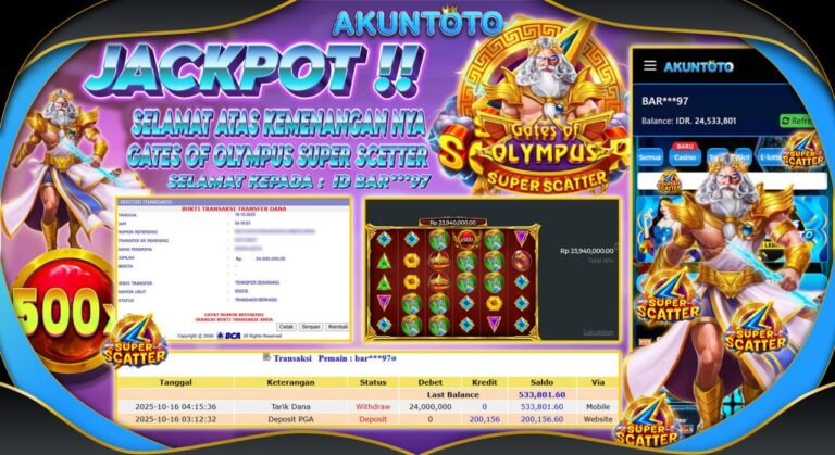 AKUNTOTO JACKPOT SLOT GATES OF OLYMPUS SUPER SCETTER Rp24.000.000 KAMIS 16 OKTOBER 2025 Selamat kepada User id : BAR***97 Telah berhasil mendapatkan kemenangan besar pada permainan GATES OF OLYMPUS SUPER SCETTER 5 – 10 menit pihak AKUNTOTO sudah melakukan transfer kepada pemilik User id dan dana sudah dapat di cairkan oleh pemenang. Bukti pembayaran yang…